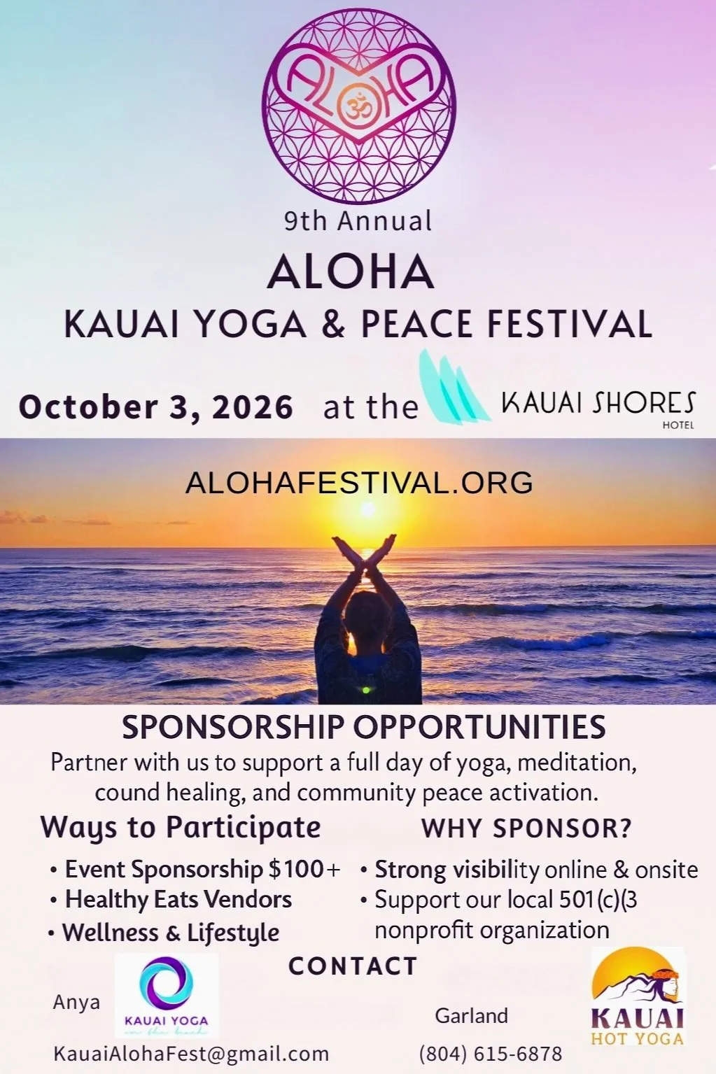 Aloha Kauai Yoga Festival & Worldwide Peace Meditation Summit is a nonprofit 501(c)(3), volunteer-run organization created to bring people together in the spirit of peace, wellness, education, and meaningful connection on the most beautiful tropical Garden Island.